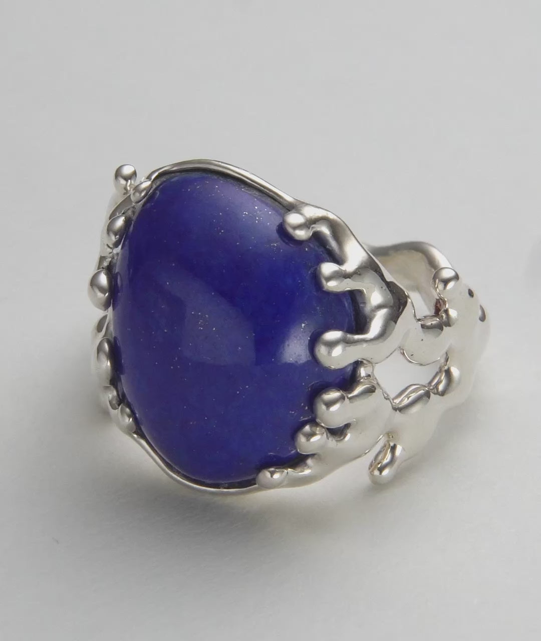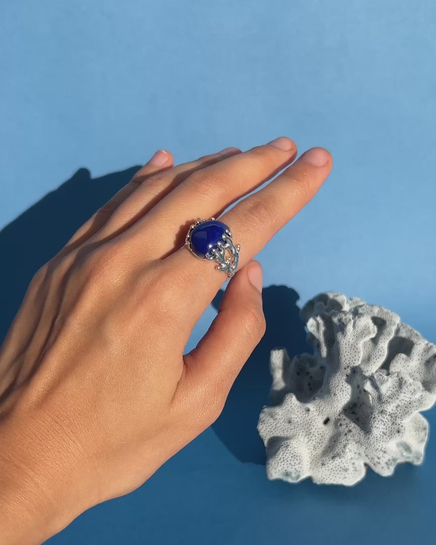Evoking the deep, mysterious blue of the ocean abyss, this ring is a seamless blend of art and nature. Drawing inspiration from the fluid, organic silhouettes of Matisse’s coral cut-outs, the sterling silver setting resembles the intricate branches of sea coral, cradling a magnificent, asymmetric Lapis Lazuli cabochon. It is the ultimate statement cocktail ring—guaranteed to captivate attention on any night out.