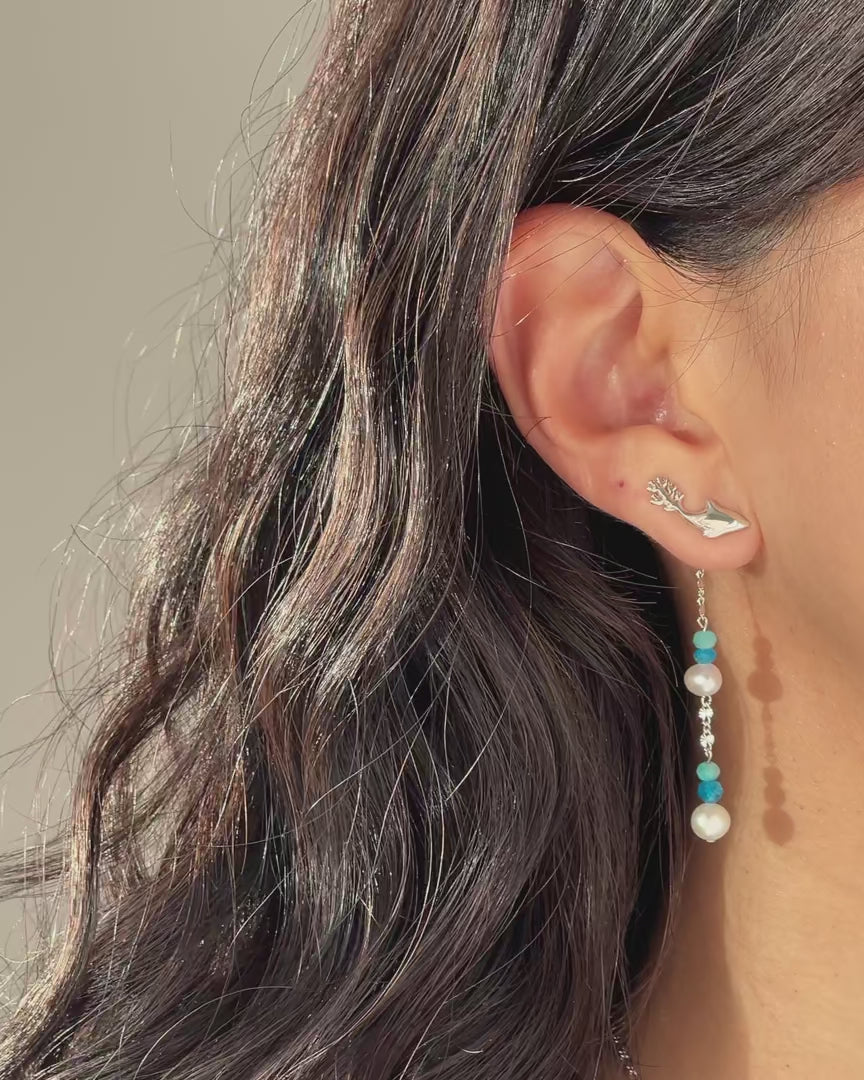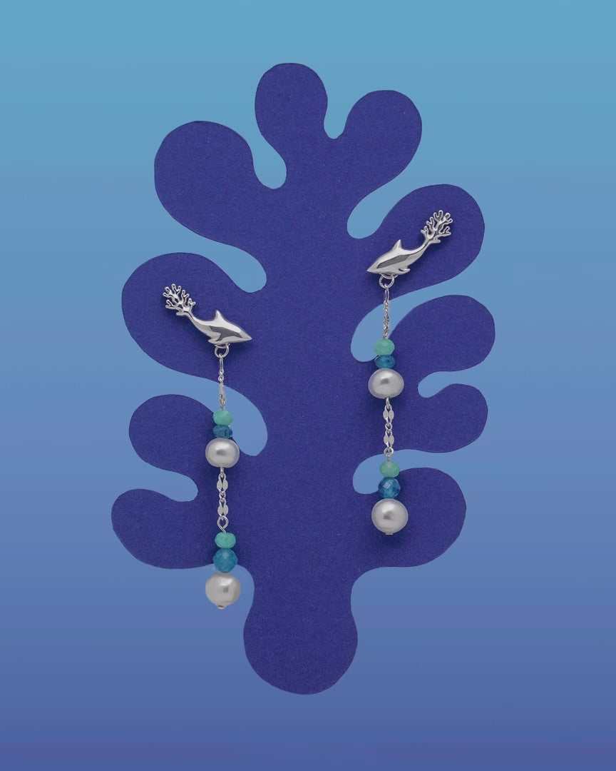 Inspired by Matisse’s coral cutouts, these silver dolphin stud earrings capture sculptural detail in a refined, intricate form. Designed for versatility, they can be worn alone for an artistic look or paired with drops of pearl, apatite, and amazonite for added playfulness. Each pair is polished to a high shine, reflecting light with elegance.